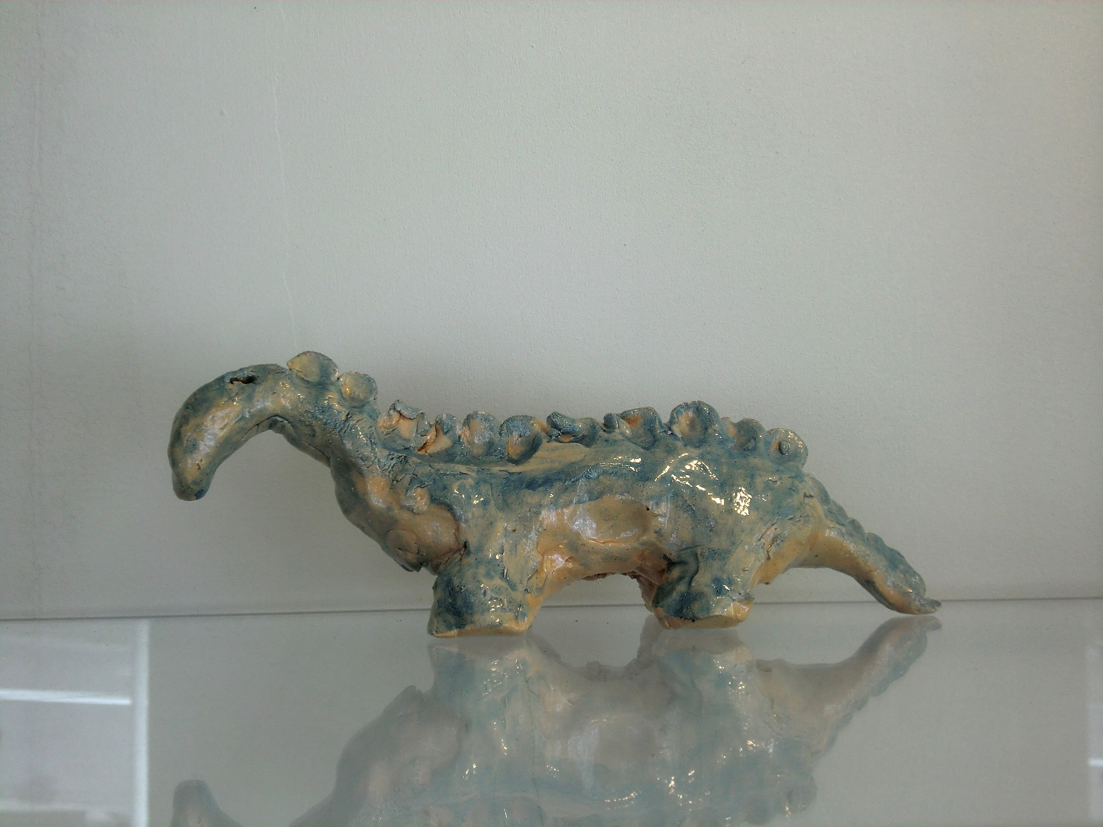 陸でも、海でも、どちらに生息していてもおかしくない見た目をしています。 背中の骨板を粘土を押しつぶしながら作ったこと、色ムラがあることなど愛着を感じます。 尻尾も地面についており、安定性もピカイチです。